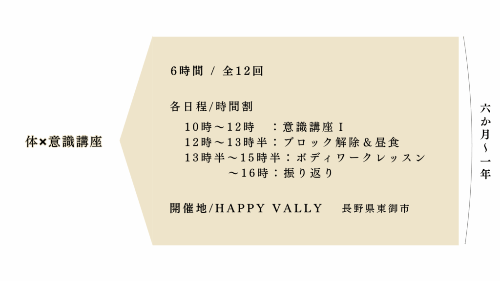内容は〈意識の研究〉コンシャスネスクラスで必須となっている、「意識Ⅱ」と同内容となります。ボディクラスでは、こちらが必須となっておりません。